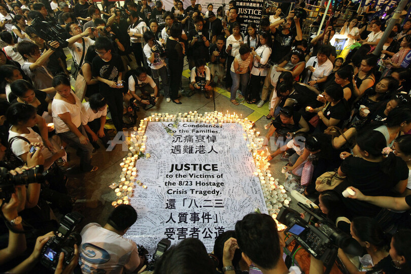 ニュース 社会 犠牲者悼みキャンドルライトと行進、マニラバス乗っ取り事件 2010年8月30日 18:50 発信地:香港 このニュースをシェア ‹ › ❮ 1/12 ❯ 香港で29日、23日にフィリピン首都マニラ(Manila)で起きた観光バス乗っ取り事件で死亡した8人を追悼する大規模な行進と、フィリピン人コミュニティーによる徹夜のキャンドルライトが行われた。8人は、事件発生から12時間後に警官隊が突入する直前に死亡した。事件への警察の対応の不手際を批判する声も広がっており、香港では悲しみと怒りに包まれた1週間となった。写真は追悼の看板に署名をしてろうそくを置く人びと(2010年8月29日撮影)。(c)AFP/ED JONES 画像作成中 ! 【8月30日 AFP】香港で29日、23日にフィリピン首都マニラ(Manila)で起きた観光バス乗っ取り事件で死亡した8人を追悼する大規模な行進と、フィリピン人コミュニティーによる徹夜のキャンドルライトが行われた。(c)AFP 社会 一覧へ> メディア・報道関係・法人の方向け 写真・動画 購入のお問合せ>