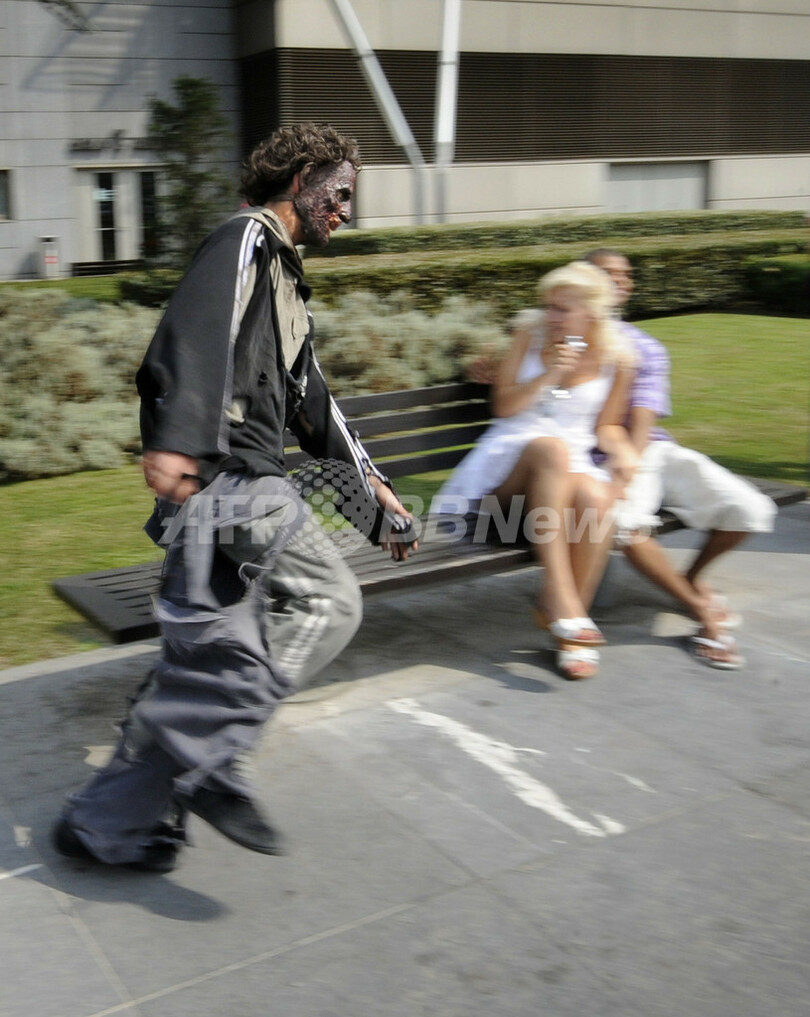 写真は、ビルバオで、カップルのそばを走る「ゾンビ」(2010年9月2日撮影)。(c)AFP/Rafa Rivas