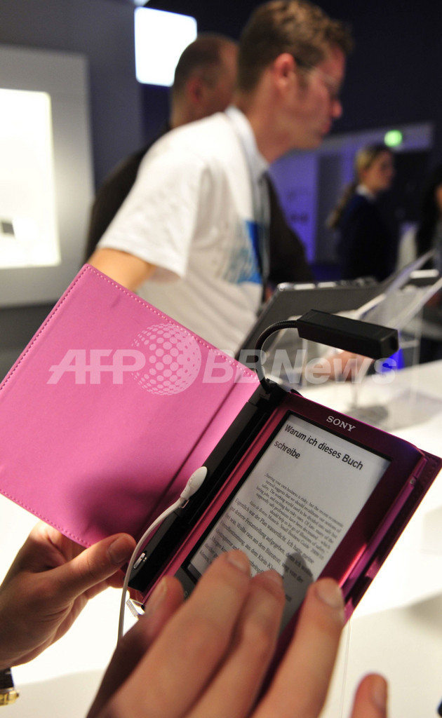 写真は、ソニー(Sony)のタッチスクリーン型電子書籍の新型閲覧端末「リーダー・ポケット・エディション(Reader Pocket Edition)」を試す来場者(2010年9月2日撮影)。(c)AFP/JOHN MACDOUGALL
