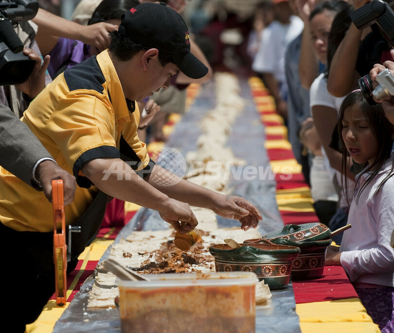 ニュース ライフ こぼれ話 ギネスに挑戦!長さ40.9メートルのタコス 2010年9月6日 9:29 発信地:メキシコ市/メキシコ [ 中南米 メキシコ ] このニュースをシェア ‹ › ❮ 9/10 ❯ メキシコのメキシコ市(Mexico City)で行われた第1回タコ&マリアッチ・フェスティバル(Taco and Mariachi Festival)で3日、長さ40.9メートルのタコスを作り、ギネス世界記録(Guinness World Record)に挑戦する催しが行われた。写真は、タコスを作る料理人(2010年9月3日撮影)。(c)AFP/Ronaldo Schemidt 画像作成中 ! 【9月6日 AFP】メキシコのメキシコ市(Mexico City)で行われた第1回タコ&マリアッチ・フェスティバル(Taco and Mariachi Festival)で3日、長さ40.9メートルのタコスを作り、ギネス世界記録(Guinness World Record)に挑戦する催しが行われた。(c)AFP ライフ 一覧へ> メディア・報道関係・法人の方向け 写真・動画 購入のお問合せ>