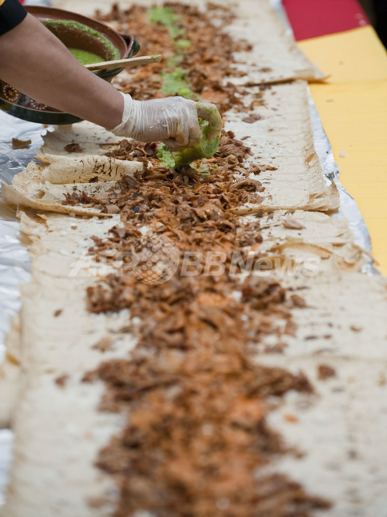 ニュース ライフ こぼれ話 ギネスに挑戦!長さ40.9メートルのタコス 2010年9月6日 9:29 発信地:メキシコ市/メキシコ [ 中南米 メキシコ ] このニュースをシェア ‹ › ❮ 8/10 ❯ メキシコのメキシコ市(Mexico City)で行われた第1回タコ&マリアッチ・フェスティバル(Taco and Mariachi Festival)で3日、長さ40.9メートルのタコスを作り、ギネス世界記録(Guinness World Record)に挑戦する催しが行われた。写真は、タコスを作る料理人(2010年9月3日撮影)。(c)AFP/Ronaldo Schemidt 画像作成中 ! 【9月6日 AFP】メキシコのメキシコ市(Mexico City)で行われた第1回タコ&マリアッチ・フェスティバル(Taco and Mariachi Festival)で3日、長さ40.9メートルのタコスを作り、ギネス世界記録(Guinness World Record)に挑戦する催しが行われた。(c)AFP ライフ 一覧へ> メディア・報道関係・法人の方向け 写真・動画 購入のお問合せ>