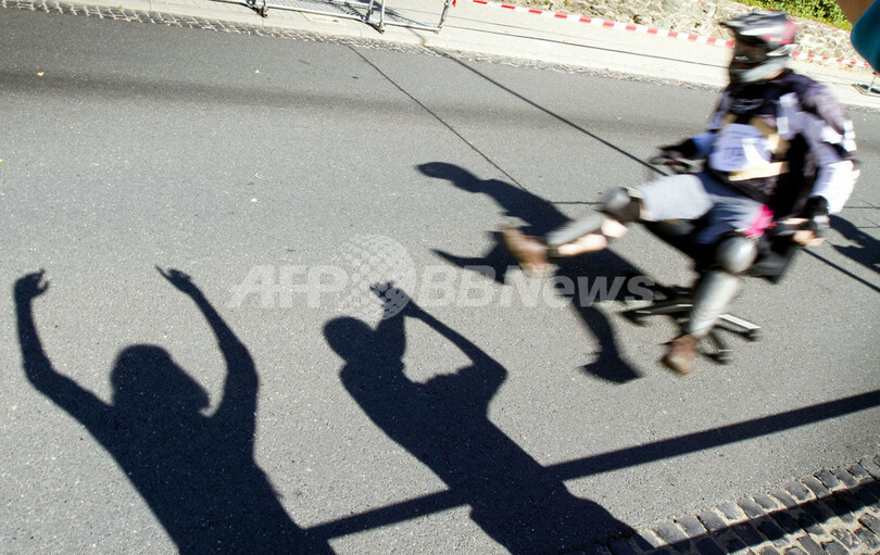 ニュース ライフ こぼれ話 デンジャラスすぎる椅子レース、ドイツ 2010年9月6日 18:52 発信地:ヴェッツラー/ドイツ [ ヨーロッパ ドイツ ] このニュースをシェア ‹ › ❮ 2/3 ❯ ドイツ西部ヘッセン(Hesse)州ヴェッツラー(Wetzlar)で開かれた、「ヘッセン州オフィスチェア競争(Hesse's Office Chair Race)」で、路上をオフィス用のイスにまたがり走り抜ける参加者と、応援する観客の影(2010年9月5日撮影)。(c)AFP/FRANK RUMPENHORST 画像作成中 ! 【9月6日 AFP】ドイツ西部ヘッセン(Hesse)州ヴェッツラー(Wetzlar)で5日、「ヘッセン州オフィスチェア競争(Hesse's Office Chair Race)」が開かれた。一番速い選手は200メートルの距離を30秒で走りきるという。(c)AFP【関連記事】オフィス用いすのスピード競争大会、ドイツ ライフ 一覧へ> メディア・報道関係・法人の方向け 写真・動画 購入のお問合せ>