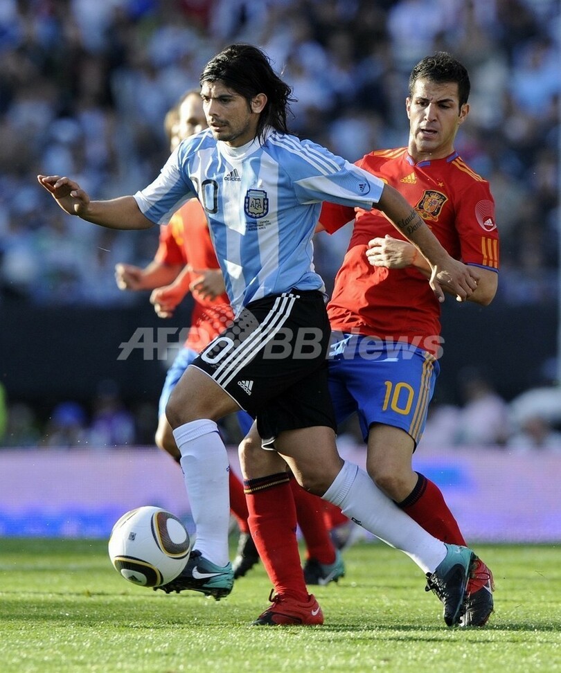 後半38分にはフェルナンド・ジョレンテ(Fernando Llorente)に得点を許してスペインに1点を返されたが、終了間際にセルヒオ・アグエロ(Sergio Aguero)が4点目を決めた。(c)AFP