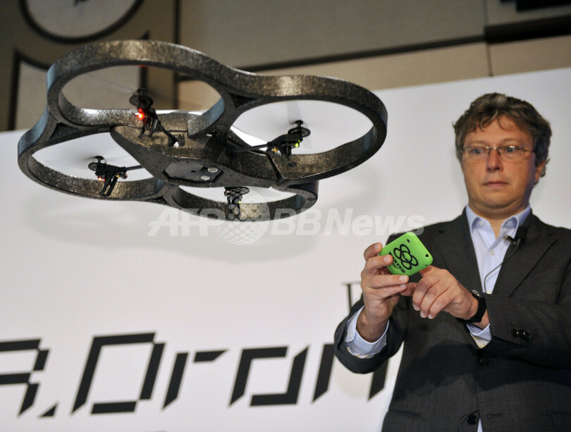 【9月10日 AFP】携帯電話のワイヤレス関連機器メーカーの仏パロット(Parrot)は9日、米アップル(Apple)の多機能携帯電話iPhone(アイフォーン)とのWi-Fi接続で操縦する小型ラジコンヘリコプター「ARドローン(AR. Drone)」を都内で公開した。4つのプロペラをもつAR. Droneは、1回の充電で12分間の飛行が可能で、最高速度は時速18キロ。16日に国内発売される。(c)AFP