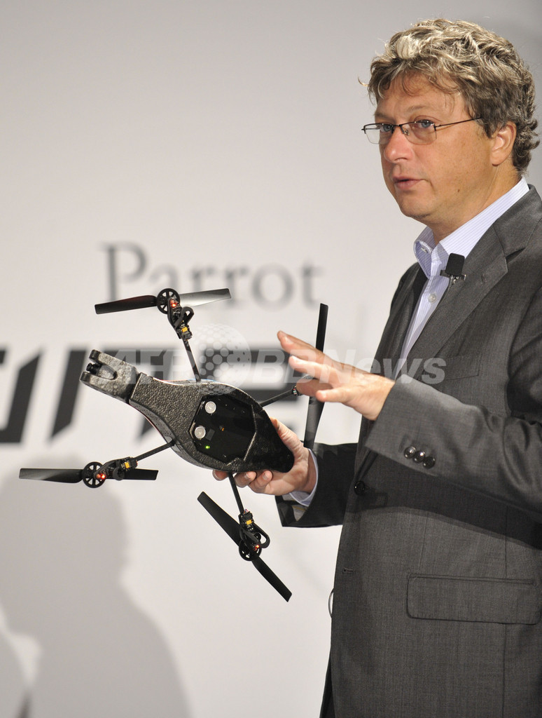 【9月10日 AFP】携帯電話のワイヤレス関連機器メーカーの仏パロット(Parrot)は9日、米アップル(Apple)の多機能携帯電話iPhone(アイフォーン)とのWi-Fi接続で操縦する小型ラジコンヘリコプター「ARドローン(AR. Drone)」を都内で公開した。4つのプロペラをもつAR. Droneは、1回の充電で12分間の飛行が可能で、最高速度は時速18キロ。16日に国内発売される。(c)AFP