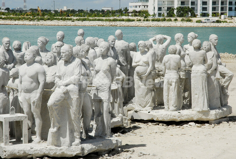 【9月10日 AFP】メキシコ・キンタナロー(Quintana Roo)州カンクン(Cancun)の浜辺に、たくさんの彫刻作品が置かれている。英国の芸術家ジェイソン・デクレアズ・テイラー(Jason de Caires Taylor)さんの作品で、同地に開かれる世界最大の水中美術館に展示されるという。(c)AFP