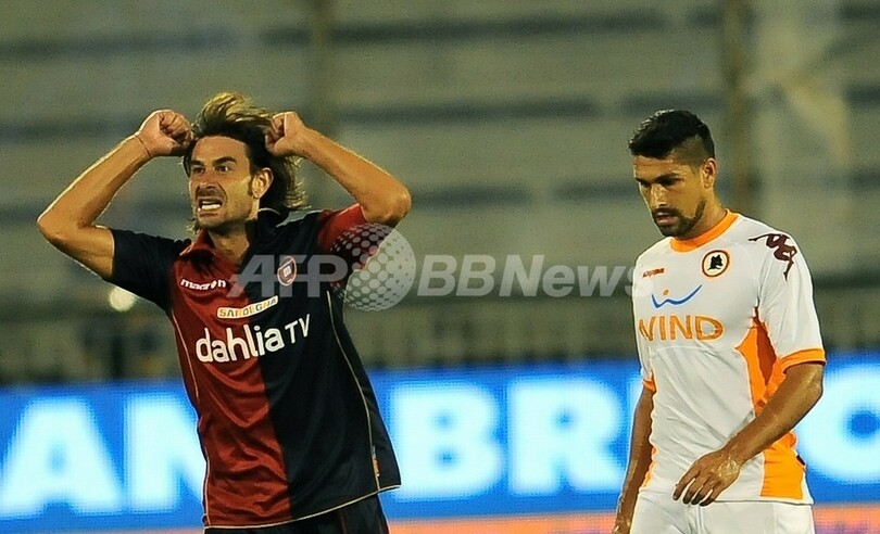 ローマは前半8分にダニエレ・コンティ(Daniele Conti)の得点で先制され、18分にはダニエレ・デ・ロッシ(Daniele De Rossi)の得点で一時は同点としたが、23分にニコラス・ブルディッソ(Nicolas Burdisso)が献上したPKをアレッサンドロ・マトリ(Alessandro Matri)に決められて勝ち越された。(c)AFP