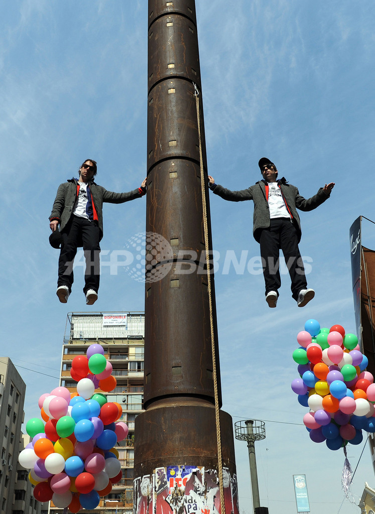 【9月13日 AFP】18日に建国200周年を迎えるチリの首都サンティアゴ(Santiago)で9日、同国出身の手品デュオ「マジック・ツインズ(Magic Twins)」が、200周年にかけて200分間宙に浮くイリュージョン・パフォーマンスを披露した。(c)AFP