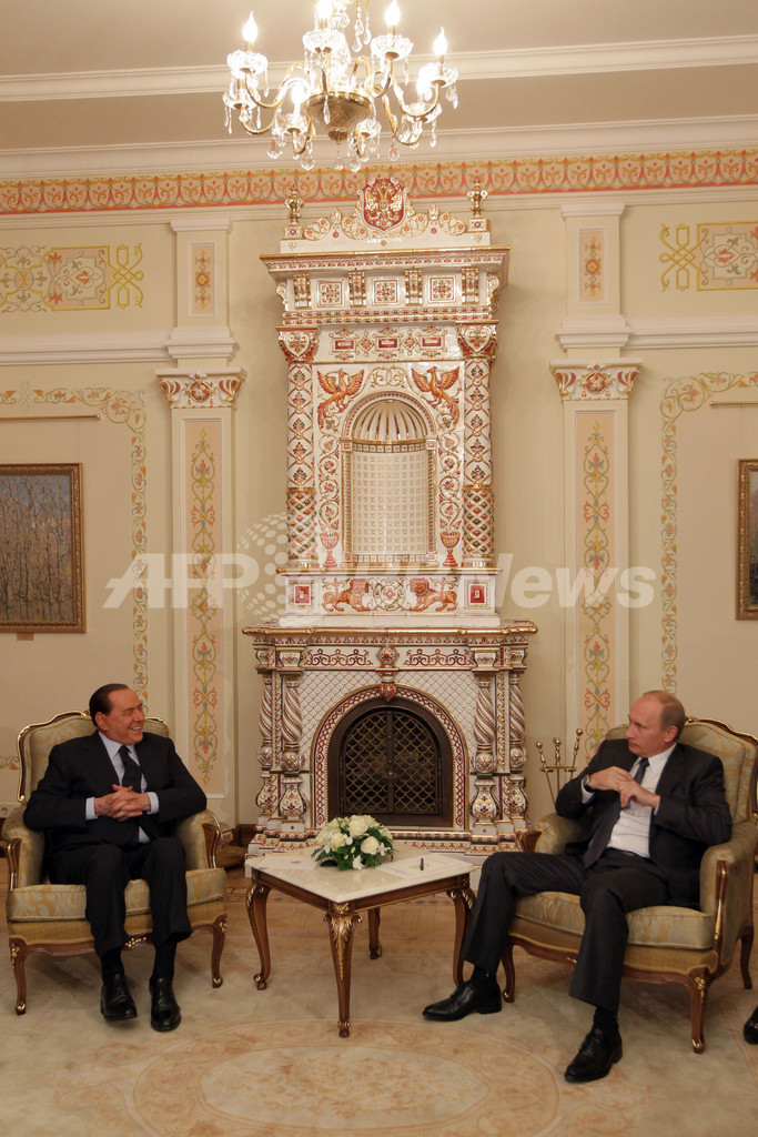 【9月13日 AFP】ロシア、モスクワ(Moscow)近郊のノボオガレボ(Novo Ogarevo)にある首相公邸で、伊露首脳会談が行われ、ロシアのウラジーミル・プーチン(Vladimir Putin)首相(57)とイタリアのシルビオ・ベルルスコーニ(Silvio Berlusconi)首相(73)が、100歳を超えても権力を掌握していたいと冗談を交わす様子が11日、ロシアNTVテレビで放映された。