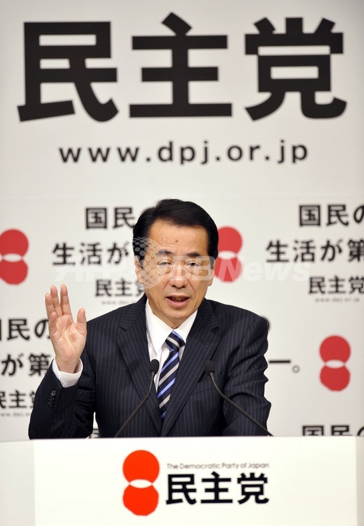 【9月14日 AFP】(一部更新、写真追加)民主党(Democratic Party of Japan、DPJ)は14日午後、都内のホテルで同党の代表を選ぶ臨時党大会を開き、菅直人(Naoto Kan)氏(63)が小沢一郎(Ichiro Ozawa)前幹事長を破って再選を果たした。
