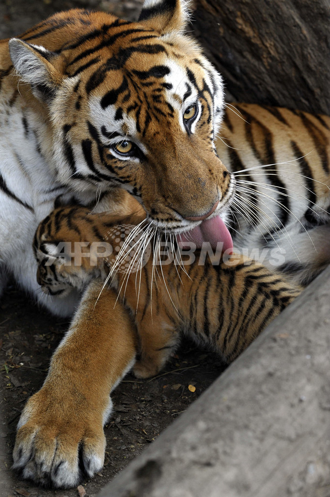 写真は、生後5日のベンガルトラの赤ちゃんをなめる母親トラ(2010年9月11日撮影)。(c)AFP/Luis ROBAYO