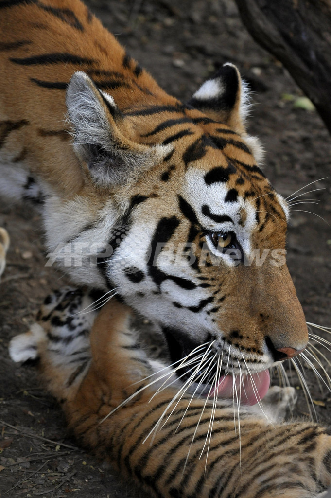 写真は、母親のベンガルトラと生後5日の赤ちゃんトラ(2010年9月11日撮影)。(c)AFP/Luis ROBAYO
