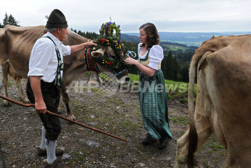 ニュース ライフ ドイツに秋の訪れ、牛が山から里帰り 2010年9月16日 11:58 発信地:ドイツ [ ヨーロッパ ドイツ ] このニュースをシェア ‹ › ❮ 9/14 ❯ ドイツ南部オーバーシュタウフェン村近くのWaltners Alpe山で10日、夏の間、山に放牧されていた牛を村に連れ帰る伝統行事「フィーシャイト(Viehscheid)」が行われた。写真は、牛を飾りつけるGmeinerさん一家(2010年9月10日撮影)。(c)AFP/CHRISTOF STACHE 画像作成中 ! 【9月16日 AFP】ドイツ南部オーバーシュタウフェン(Oberstaufen)村近くのWaltners Alpe山で10日、夏の間、山に放牧されていた牛を村に連れ帰る伝統行事「フィーシャイト(Viehscheid)」が行われた。(c)AFP ライフ 一覧へ> メディア・報道関係・法人の方向け 写真・動画 購入のお問合せ>