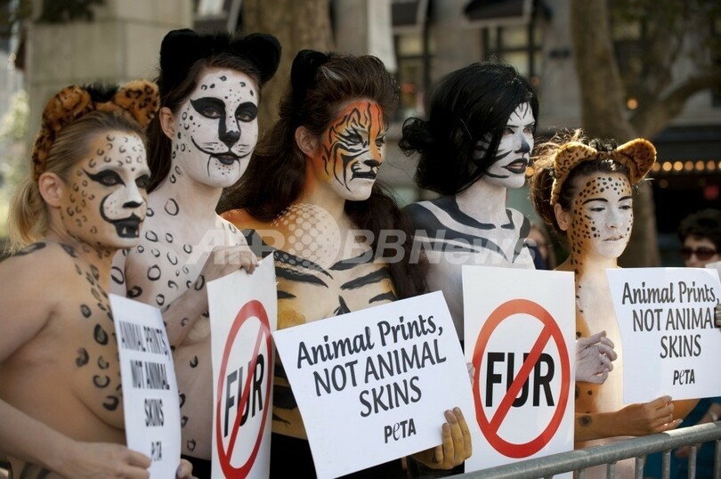 【9月16日 AFP】「メルセデスベンツ・ファッション・ウィーク(Mercedes-Benz Fashion Week)」が開催されている米ニューヨーク(New York)のリンカーンセンター(Lincoln Center)前で14日、動物愛護団体PETA(動物の倫理的扱いを求める人々の会)の支持者らがトラやヒョウ、シマウマに似せて全身にボディーペインティングを施した姿でプラカードをかかげ、ファッション・ウィークの出席者に向けて、動物が毛皮・皮革産業の被害に苦しんでいると訴えた。(c)AFP