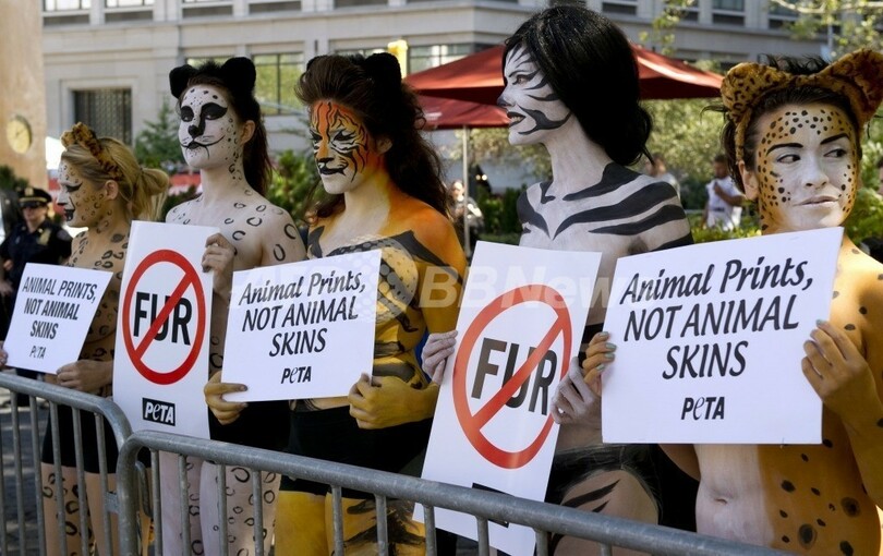 【9月16日 AFP】「メルセデスベンツ・ファッション・ウィーク(Mercedes-Benz Fashion Week)」が開催されている米ニューヨーク(New York)のリンカーンセンター(Lincoln Center)前で14日、動物愛護団体PETA(動物の倫理的扱いを求める人々の会)の支持者らがトラやヒョウ、シマウマに似せて全身にボディーペインティングを施した姿でプラカードをかかげ、ファッション・ウィークの出席者に向けて、動物が毛皮・皮革産業の被害に苦しんでいると訴えた。(c)AFP