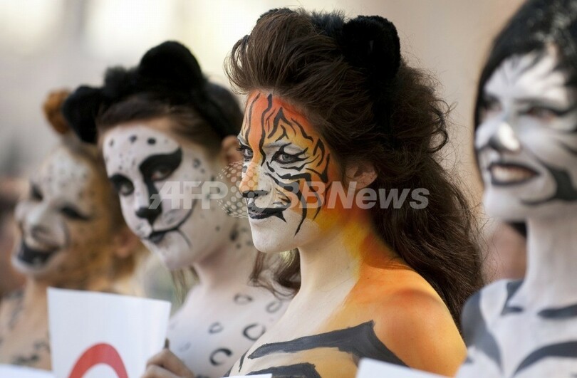 【9月16日 AFP】「メルセデスベンツ・ファッション・ウィーク(Mercedes-Benz Fashion Week)」が開催されている米ニューヨーク(New York)のリンカーンセンター(Lincoln Center)前で14日、動物愛護団体PETA(動物の倫理的扱いを求める人々の会)の支持者らがトラやヒョウ、シマウマに似せて全身にボディーペインティングを施した姿でプラカードをかかげ、ファッション・ウィークの出席者に向けて、動物が毛皮・皮革産業の被害に苦しんでいると訴えた。(c)AFP