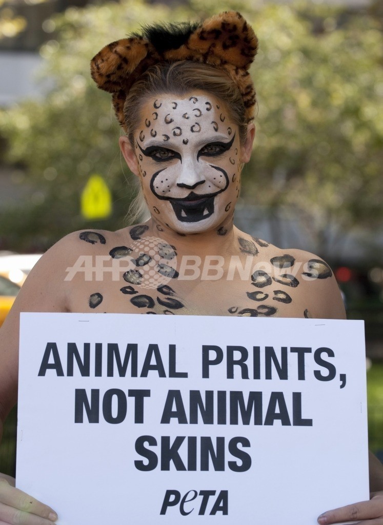 【9月16日 AFP】「メルセデスベンツ・ファッション・ウィーク(Mercedes-Benz Fashion Week)」が開催されている米ニューヨーク(New York)のリンカーンセンター(Lincoln Center)前で14日、動物愛護団体PETA(動物の倫理的扱いを求める人々の会)の支持者らがトラやヒョウ、シマウマに似せて全身にボディーペインティングを施した姿でプラカードをかかげ、ファッション・ウィークの出席者に向けて、動物が毛皮・皮革産業の被害に苦しんでいると訴えた。(c)AFP