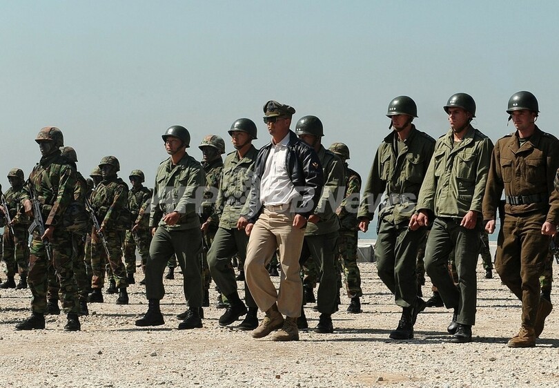 写真は、仁川上陸作戦の再現でマッカーサー将軍(中)や米国や韓国軍の大将を演じる米海兵隊員(2010年9月15日撮影)。(c)AFP/YANG HOI-SUNG