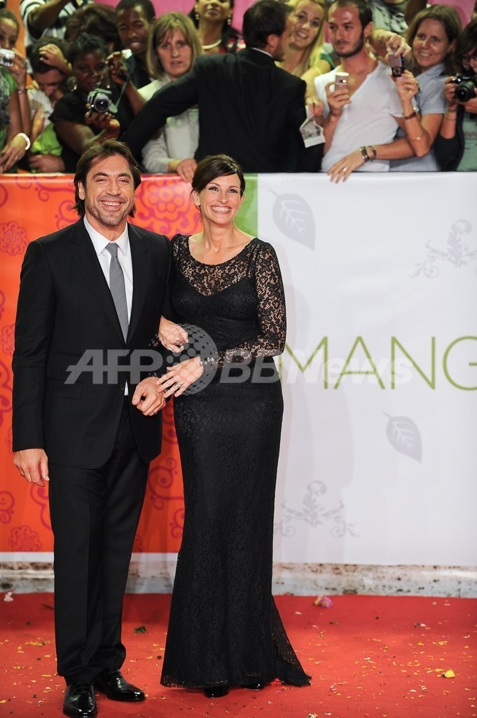 日本では17日に公開を迎える映画『食べて、祈って、恋をして(Eat Pray Love)』の上映会が16日、イタリア・ローマ(Rome)で開催され、主演のジュリア・ロバーツ(Julia Roberts)らが出席した。写真は、レッドカーペットに登場したロバーツ(右)と共演者のハビエル・バルデム(Javier Bardem、2010年9月16日撮影)。(c)AFP/ANDREAS SOLARO