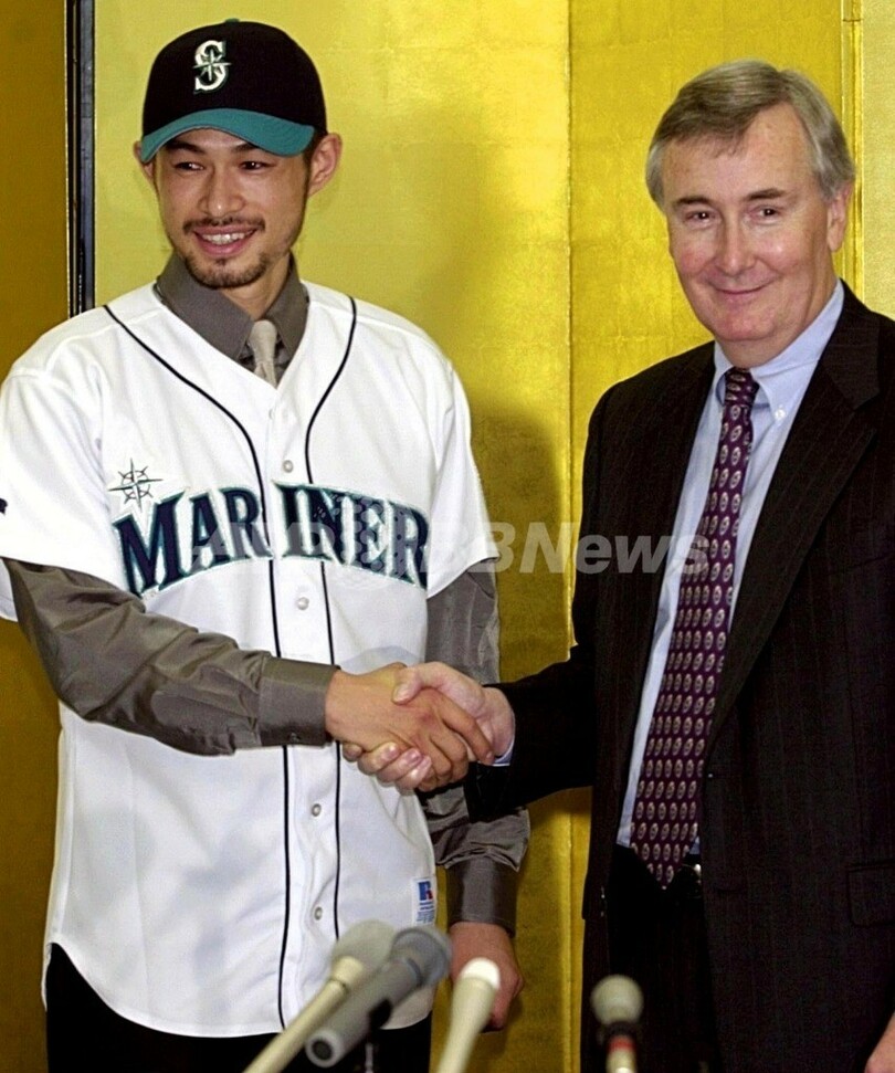 京都(Kyoto)で開かれた契約発表会見で、シアトル・マリナーズ(Seattle Mariners)のユニホームを着てマリナーズのハワード・リンカーン(Howard Lincoln)CEOと握手を交わすイチロー選手(2000年11月19日撮影)。(c)AFP