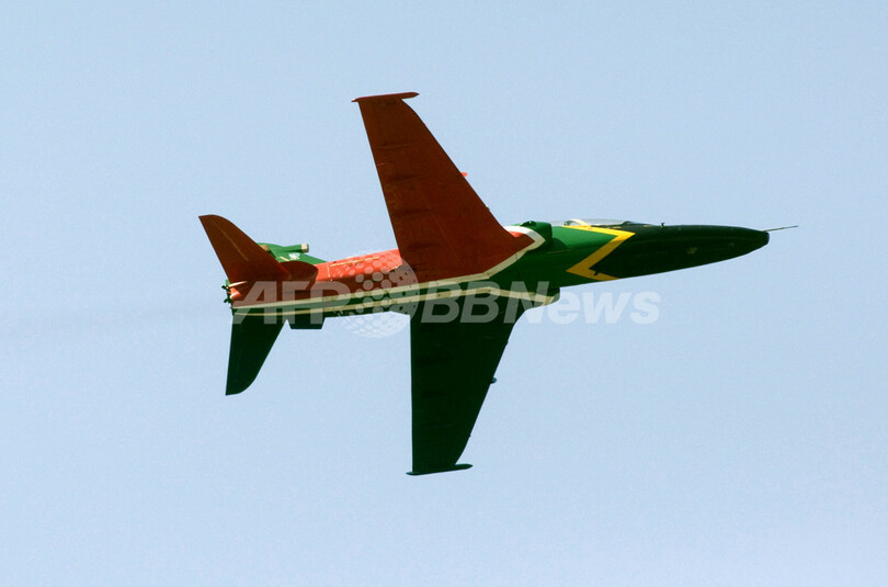 南アフリカ・ケープタウン(Cape Town)のエイステールプラート(Ysterplaat)空軍基地で開催されたアフリカ航空宇宙・防衛ショー(Africa Aeronautics and Defence Airshow)でデモ飛行するナショナル・カラーに塗られた南ア空軍の練習機ホーク(Hawk、2010年9月24日撮影)。(c)AFP/RODGER BOSCH