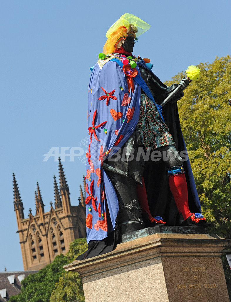 【9月28日 AFP】オーストラリア・シドニー(Sydney)で、23日から芸術祭「アート・アンド・アバウト・シドニー2010(Art & About Sydney 2010)」が開催されている。アートプロジェクト「シドニー・スタチューズ・プロジェクト!(Sydney Statues: Project!)」では、英国のビクトリア女王(Queen Victoria)、ビクトリア女王の夫アルバート公(Prince Albert)、クック船長(Captain Cook)など、シドニーの有名な8体の銅像に、地元のテキスタイルデザイナーや、ファッションデザイナー、コスチュームデザイナーの作った衣装が着せられている。会期は10月24日まで。(c)AFP