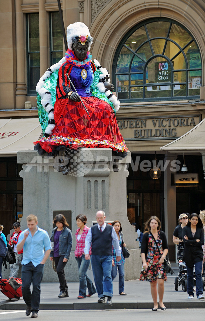 【9月28日 AFP】オーストラリア・シドニー(Sydney)で、23日から芸術祭「アート・アンド・アバウト・シドニー2010(Art & About Sydney 2010)」が開催されている。アートプロジェクト「シドニー・スタチューズ・プロジェクト!(Sydney Statues: Project!)」では、英国のビクトリア女王(Queen Victoria)、ビクトリア女王の夫アルバート公(Prince Albert)、クック船長(Captain Cook)など、シドニーの有名な8体の銅像に、地元のテキスタイルデザイナーや、ファッションデザイナー、コスチュームデザイナーの作った衣装が着せられている。会期は10月24日まで。(c)AFP
