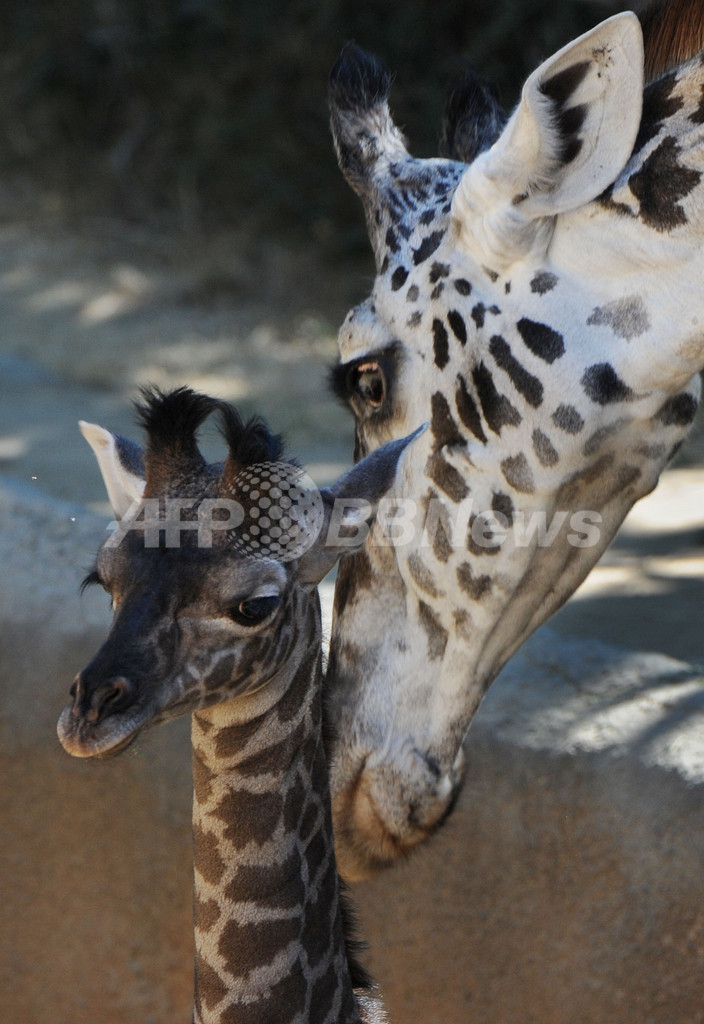 【9月29日 AFP】米ロサンゼルス(Los Angeles)のロサンゼルス動物園(Los Angeles Zoo)で3週間前に生まれたばかりのメスのマサイキリンの赤ちゃん、シャニー(Shani)。(c)AFP