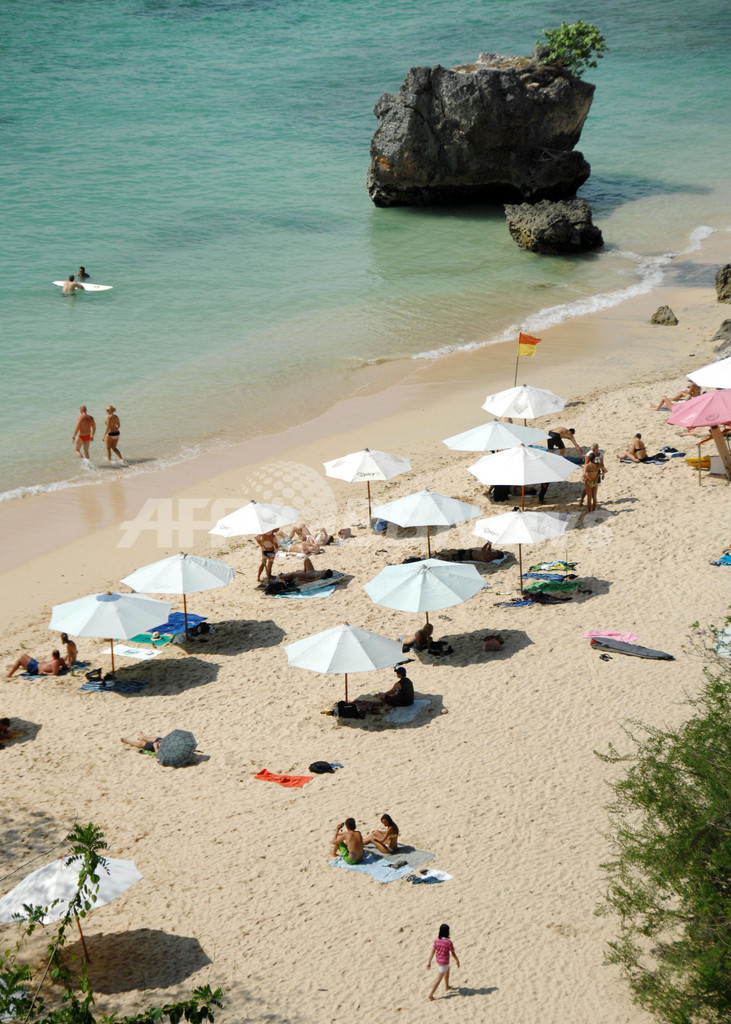 写真は、バリ島クタ(Kuta)近くのパダンパダンビーチ(Padang-padang beach)で、日光浴と海水浴を楽しむ旅行客(2010年9月15日撮影)。(c)AFP/SONNY TUMBELAKA