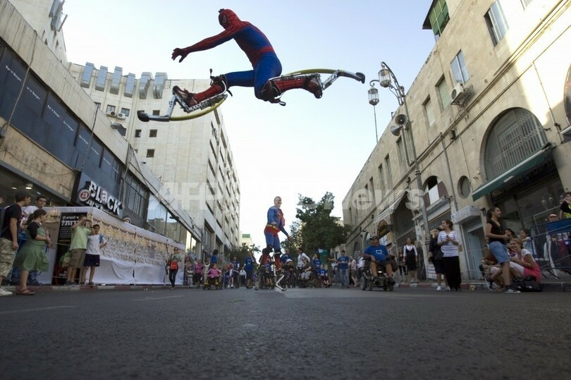 写真は、スパイダーマンの格好をしてパレードでジャンプして見せる男性(2010年9月28日撮影)。(c)AFP/AHMAD GHARABLI