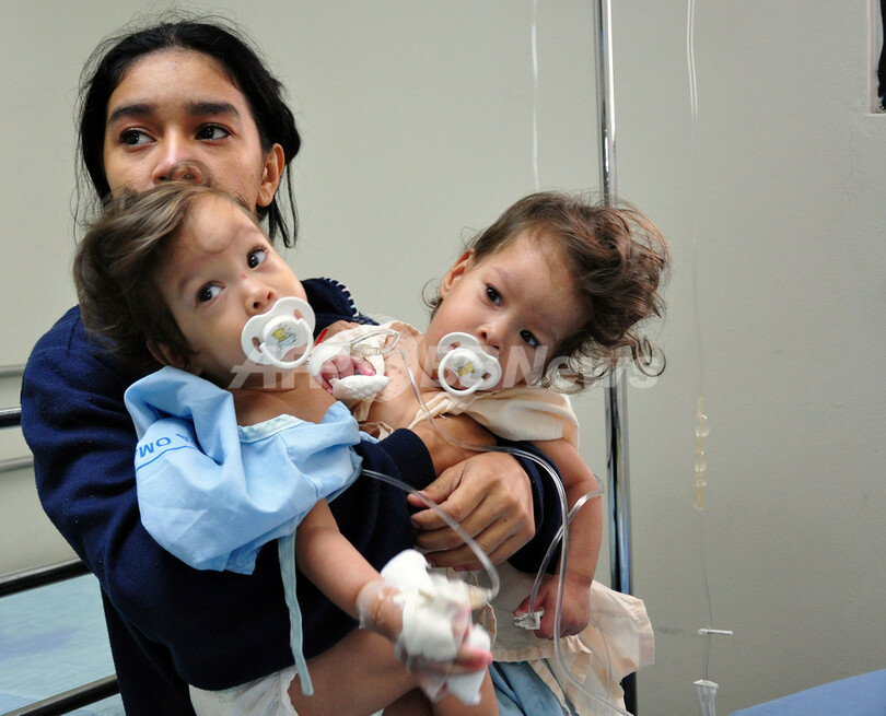 ニュース ライフ パナマ初、結合双生児の分離手術 2010年10月1日 16:46 発信地:パナマ市/パナマ [ 中南米 パナマ ] このニュースをシェア ‹ › ❮ 1/6 ❯ パナマ首都パナマ市(Panama City)で、分離手術の前に結合双生児の姉妹を抱える母親のSara Lizbeth Gilさん(2010年9月28日撮影)。(c)AFP/Armando Acevedo 画像作成中 ! 【10月1日 AFP】中米パナマの首都パナマ市(Panama City)で28日、腹部がつながった結合双生児の分離手術が行われた。分離手術を受けたのはHannah YinethちゃんとHannah Yanethちゃんの双子の姉妹。パナマやアルゼンチンから集まった総勢50人の医療チームが、同国では初めての分離手術を行った。手術は8時間に及んだ。(c)AFP ライフ 一覧へ> メディア・報道関係・法人の方向け 写真・動画 購入のお問合せ>
