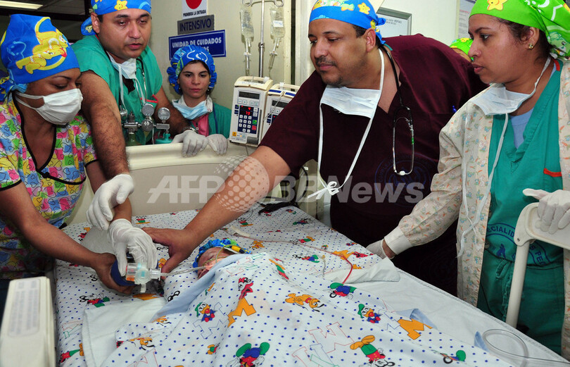 ニュース ライフ パナマ初、結合双生児の分離手術 2010年10月1日 16:46 発信地:パナマ市/パナマ [ 中南米 パナマ ] このニュースをシェア ‹ › ❮ 4/6 ❯ パナマ首都パナマ市(Panama City)で、手術後に手術室から出てきたHannah Yinethちゃん(2010年9月28日撮影)。(c)AFP/Armando Acevedo 画像作成中 ! 【10月1日 AFP】中米パナマの首都パナマ市(Panama City)で28日、腹部がつながった結合双生児の分離手術が行われた。分離手術を受けたのはHannah YinethちゃんとHannah Yanethちゃんの双子の姉妹。パナマやアルゼンチンから集まった総勢50人の医療チームが、同国では初めての分離手術を行った。手術は8時間に及んだ。(c)AFP ライフ 一覧へ> メディア・報道関係・法人の方向け 写真・動画 購入のお問合せ>