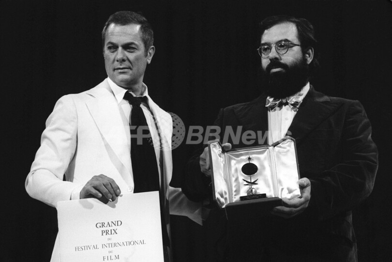 カンヌ国際映画祭(Cannes Film Festival)でフランシス・フォード・コッポラ(Francis Ford Coppola)監督(右)グランプリを授与した米俳優トニー・カーティス(Tony Curtis)さん(左、1974年5月25日撮影)。(c)AFP