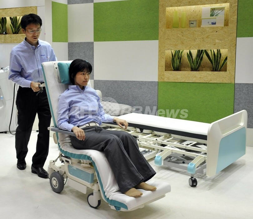 【10月1日 AFP】パナソニック(Panasonic)は9月29日~10月1日の日程で都内で開催された第37回国際福祉機器展(Home Care & Rehabilitation Exhibition)で、ロボット技術を応用して開発した、ベッドと車いすに相互に形状が変化する「電動ケアベッド」と、頭の形を3次元的にスキャニングして16個の「指先」で頭髪を洗浄する「洗髪ロボット」を公開した。2012年度の商品化を目指す。(c)AFP