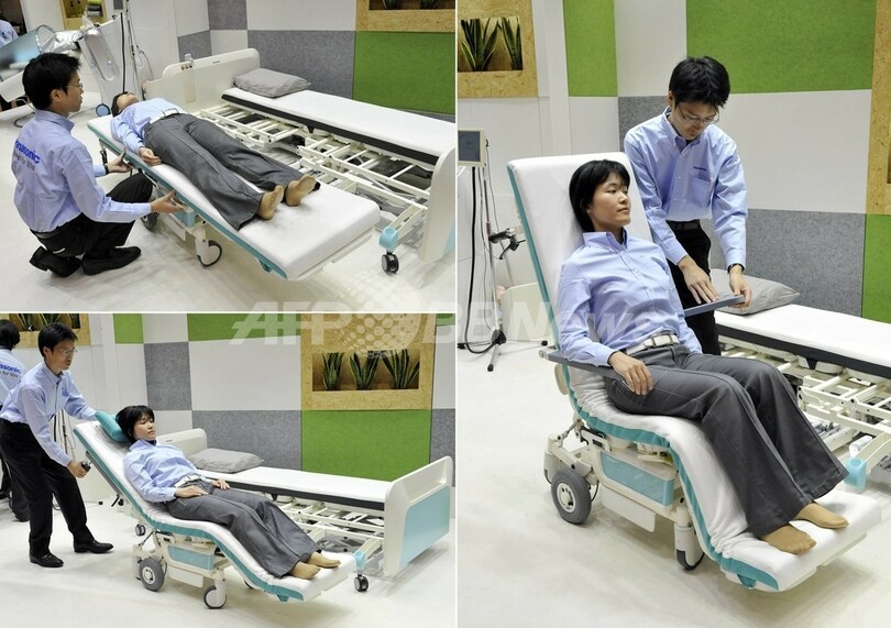 【10月1日 AFP】パナソニック(Panasonic)は9月29日~10月1日の日程で都内で開催された第37回国際福祉機器展(Home Care & Rehabilitation Exhibition)で、ロボット技術を応用して開発した、ベッドと車いすに相互に形状が変化する「電動ケアベッド」と、頭の形を3次元的にスキャニングして16個の「指先」で頭髪を洗浄する「洗髪ロボット」を公開した。2012年度の商品化を目指す。(c)AFP