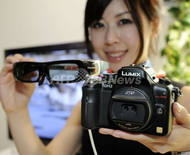 写真は、パナソニック(Panasonic)のブースに展示された、交換レンズ装着で3Dテレビで観ることのできる3D画像を撮影可能な同社の新型デジタル一眼レフカメラ「Lumix GH-2」。10月29日発売(2010年10月5日撮影)。(c)AFP/Yoshikazu TSUNO