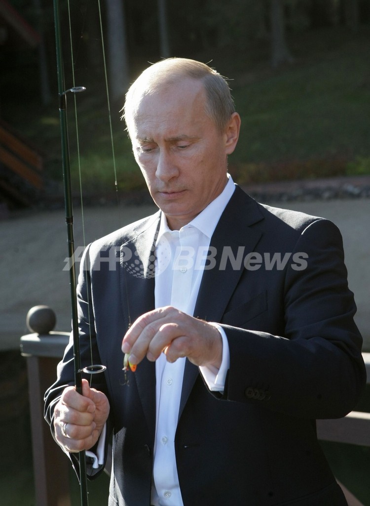 ロシア・サンクトペテルブルク(Saint Petersburg)で、イタリアのシルビオ・ベルルスコーニ(Silvio Berlusconi)首相(写真外)と釣りを楽しむ、ロシアのウラジーミル・プーチン(Vladimir Putin)首相(2010年10月9日撮影)。(c)AFP/RIA NOVOSTI/ALEXEI NIKOLSKY