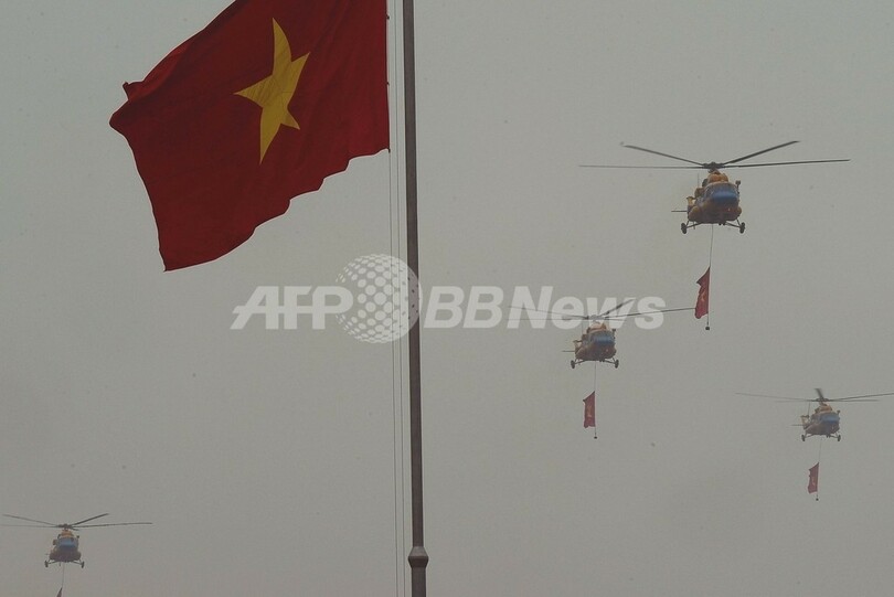 国旗と社会主義を表す鎚と鎌を描いた旗を引いたロシア製ヘリ10機が上空を通過して始まったパレードには公式発表で約4万人が参加した。共産党幹部らはホーチミン廟の上に設けられた席から、ひざを曲げずに脚を高く上げて行進する兵士や警察官らに手を振った。