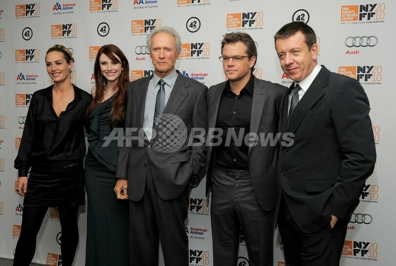 クリント・イーストウッド(Clint Eastwood)監督最新作『ヒアアフター(原題、Hereafter)』が10日、第48回ニューヨーク映画祭(New York Film Festival)でクロージング上映された。会場には、主演のマット・デイモン(Matt Damon)をはじめ、セシル・ドゥ・フランス(Cecile de France)、ブライス・ダラス・ハワード(Bryce Dallas Howard)ら出演者が姿を見せた。写真は、(左から)ドゥ・フランス、ハワード、イーストウッド監督、デイモン、脚本家のピーター・モーガン(Peter Morgan、2010年10月10日撮影)。(c)AFP/Getty Images/Jemal Countess