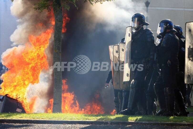 写真はカン(Caen)で、デモ隊の暴徒化を受け、経営者団体フランス企業運動(MEDEF)の本部を警備する機動隊(2010年10月12日撮影)。(c)AFP/KENZO TRIBOUILLARD
