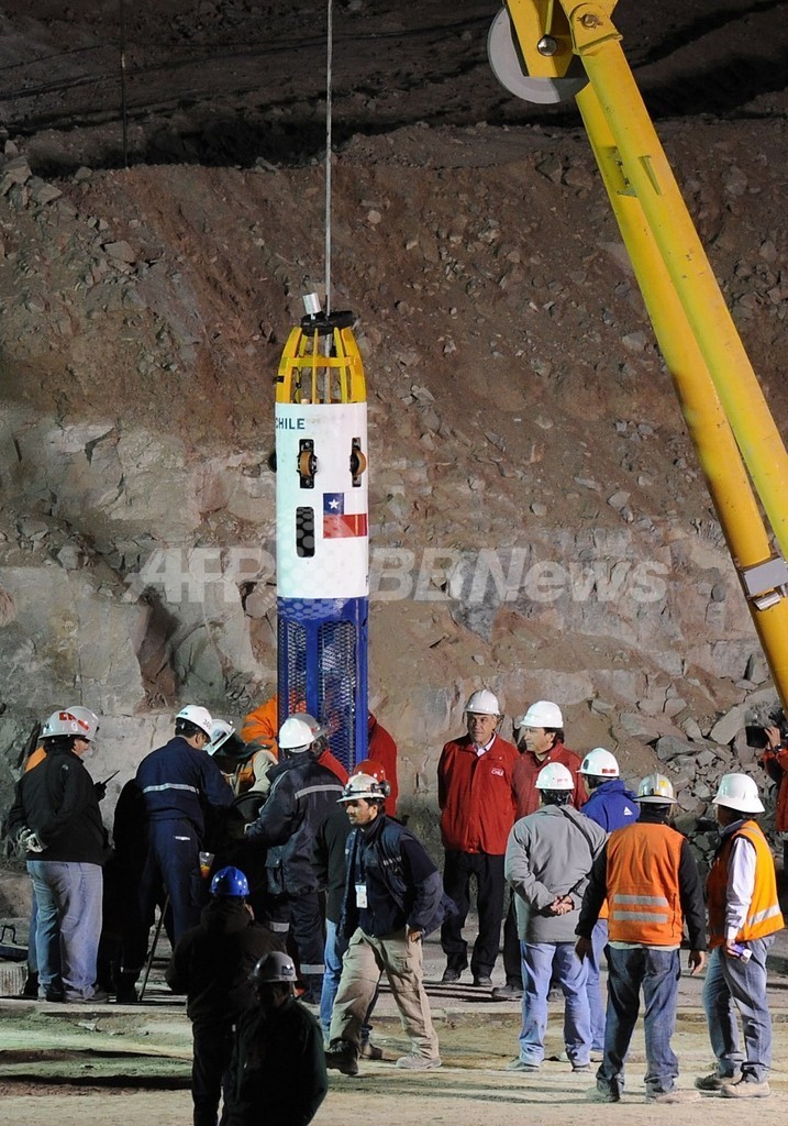 【10月13日 AFP】(一部更新、写真追加)チリ北部のサンホセ(San Jose)鉱山の落盤事故は13日未明(日本時間同日正午ごろ)、地下に閉じこめられている作業員33人の救出用カプセルが降ろされ、1人目の作業員、フローレンシオ・アバロス(Florencio Avalos)さん(31)が事故から69日ぶりに地上に引き上げられた。