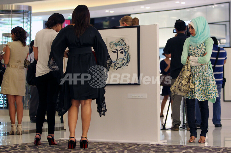 「The Bazaar Years 1951-1964」と題された同展では、ウォーホルがファッション誌「ハーパース・バザー(Harper’s Bazaar)」のために手がけた作品を展示。モール内の広い通路に設けられた展示スペースには、一般買い物客が足を止めて、米国外で初公開となる作品を鑑賞した。(c)AFP