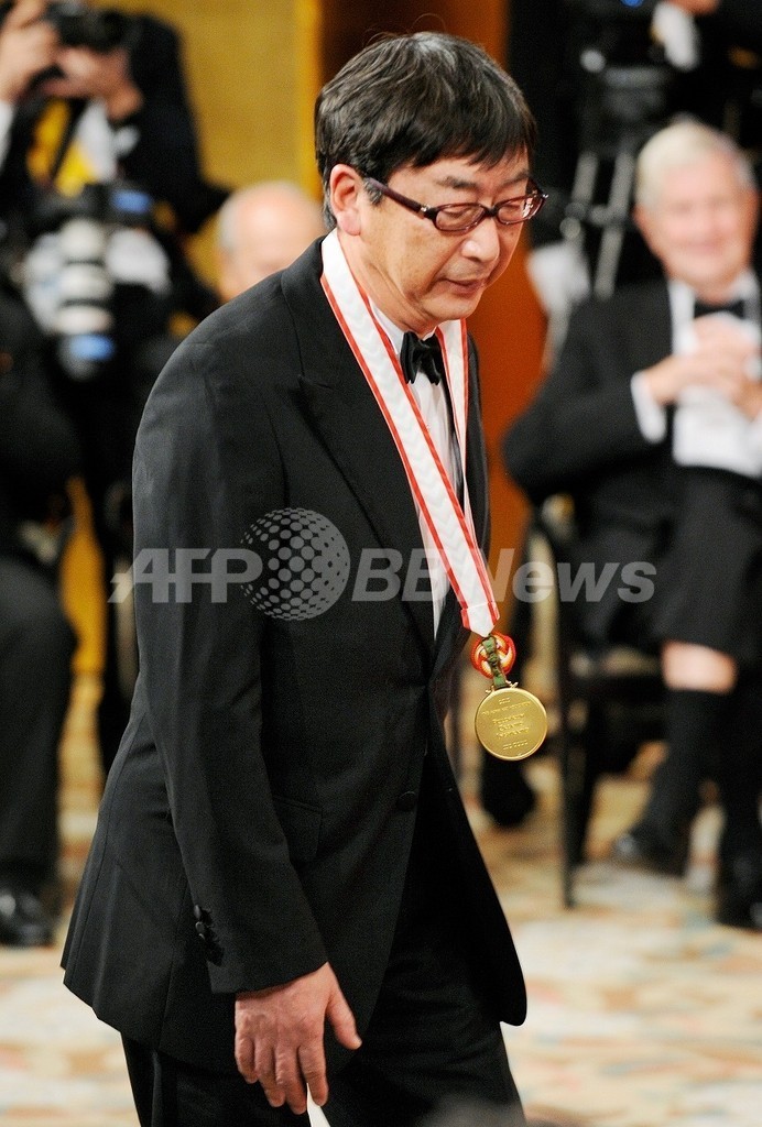 世界的に顕著な業績を挙げた芸術家に贈られる高松宮殿下記念世界文化賞(Praemium Imperiale Awards)の第22回授賞式典が13日、都内で開催された。今年は、演劇・映像部門でイタリアの女優ソフィア・ローレン(Sophia Loren)さん、音楽部門でイタリアのピアニスト、マウリツィオ・ポリーニ(Maurizio Pollini)さん、建築部門で伊東豊雄(Toyo Ito)さん、彫刻部門でドイツの彫刻家レベッカ・ホルン(Rebecca Horn)さん、絵画部門でイタリアの画家エンリコ・カステラーニ(Enrico Castellani)さんが受賞した。写真は、メダルを授与された伊東さん(2010年10月14日撮影)。(c)AFP/Toru YAMANAKA