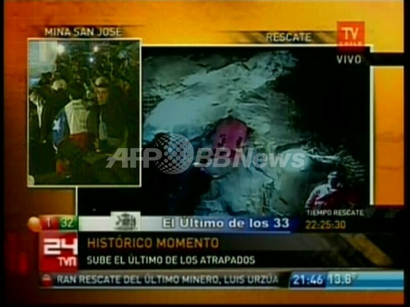 【10月14日 AFP】(写真追加、一部更新)チリ北部のサンホセ(San Jose)鉱山で13日夜(日本時間14日午前)、地下に閉じこめられていた最後の鉱山作業員でリーダーのルイス・ウルスア(Luis Urzua)さんが救出され、33人全員が無事生還した。