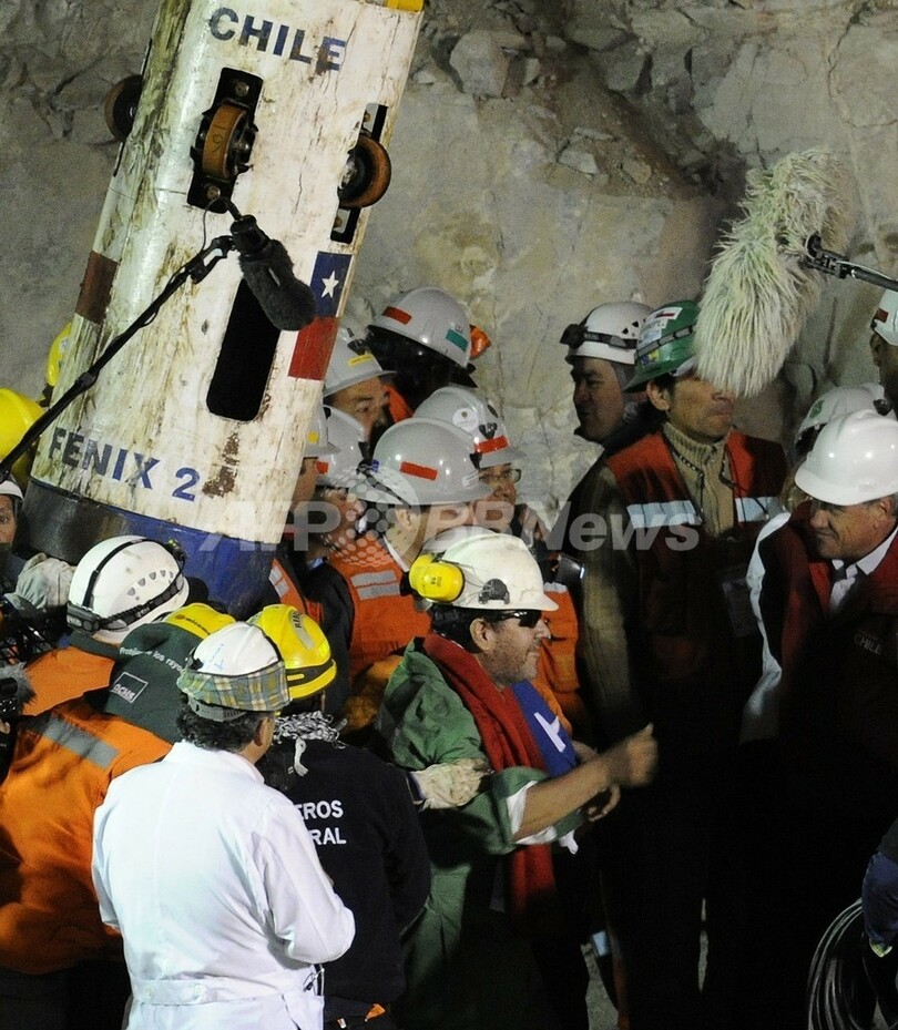 【10月14日 AFP】(写真追加、一部更新)チリ北部のサンホセ(San Jose)鉱山で13日夜(日本時間14日午前)、地下に閉じこめられていた最後の鉱山作業員でリーダーのルイス・ウルスア(Luis Urzua)さんが救出され、33人全員が無事生還した。