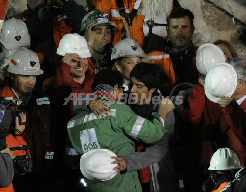 【10月14日 AFP】(写真追加、一部更新)チリ北部のサンホセ(San Jose)鉱山で13日夜(日本時間14日午前)、地下に閉じこめられていた最後の鉱山作業員でリーダーのルイス・ウルスア(Luis Urzua)さんが救出され、33人全員が無事生還した。