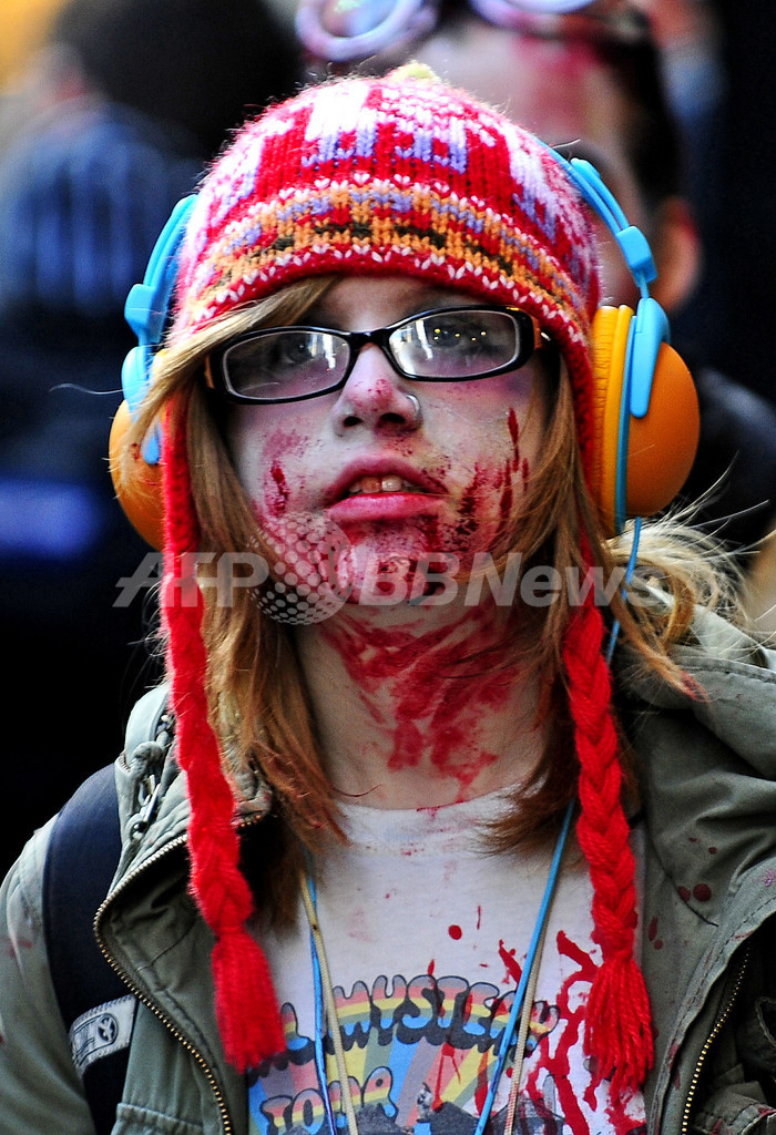 ニュース ライフ こぼれ話 マンハッタンがゾンビの街に 2010年10月17日 9:19 発信地:ニューヨーク/米国 [ 北米 米国 ] このニュースをシェア ‹ › ❮ 3/64 ❯ ニューヨーク市(New York City)のマンハッタン(Manhattan)で16日、毎年恒例のゾンビの祭典「ゾンビコン(Zombiecon)」が開催され、数百人のゾンビたちが街を練り歩き、バーやパブなどに顔を出した。このイベントは、ことしで6回目(2010年10月16日撮影)。(c)AFP/Emmanuel Dunand 画像作成中 ! 【10月17日 AFP】ニューヨーク市(New York City)のマンハッタン(Manhattan)で16日、毎年恒例のゾンビの祭典「ゾンビコン(Zombiecon)」が開催され、数百人のゾンビたちが街を練り歩き、バーやパブなどに顔を出した。このイベントは、ことしで6回目。(c)AFP ライフ 一覧へ> メディア・報道関係・法人の方向け 写真・動画 購入のお問合せ>