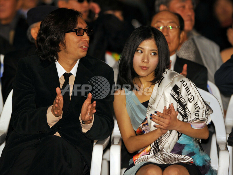 9日間にわたって開催された第15回釜山国際映画祭(Pusan International Film Festival)は15日、オムニバス映画『Camellia』のクロージング上映と授賞式をもって閉幕した。『Camellia』は、日本、韓国、タイの3人の監督が手がけた3つのストーリーからなる作品。閉会式には日本の行定勲(Isao Yukisada)監督のパートに出演した吉高由里子(Yuriko Yoshitaka)らが出席した。写真は、行定監督(左)と吉高(右、2010年10月15日撮影)。(c)AFP/KIM JAE-HWAN
