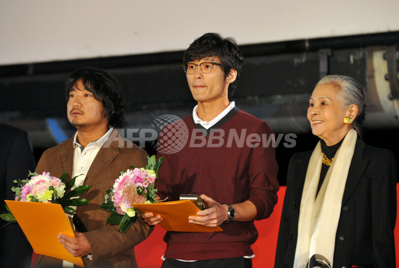 9日間にわたって開催された第15回釜山国際映画祭(Pusan International Film Festival)は15日、オムニバス映画『Camellia』のクロージング上映と授賞式をもって閉幕した。『Camellia』は、日本、韓国、タイの3人の監督が手がけた3つのストーリーからなる作品。閉会式には日本の行定勲(Isao Yukisada)監督のパートに出演した吉高由里子(Yuriko Yoshitaka)らが出席した。写真は、(左から)ニューカレンツ賞を受賞した韓国作品『The Journals of Musan』のパク・チョンボム(Park Jung-Bum)監督吉高、同『Bleak Night』のユン・ソンヒョン(Yoon Sung-Hyun)監督、ニューカレンツ部門の審査委員長を務めたワダ・エミ(Emi Wada、2010年10月15日撮影)。(c)AFP/KIM JAE-HWAN
