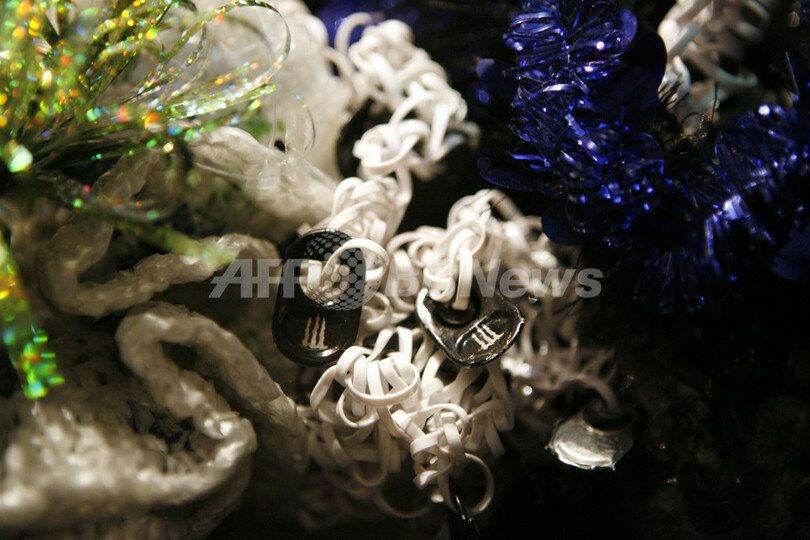 3歳から101歳まで約800人の女性に数人の男性も加わり、複雑によじれたサンゴの枝やイソギンチャク、ヒトデなどを毛糸で編み上げた。中には、リサイクル素材を活用した作品や、高さ3メートルに達する大作もある(2010年10月14日撮影)。(c)AFP/Virginie Montet/Kimihiro Hoshino